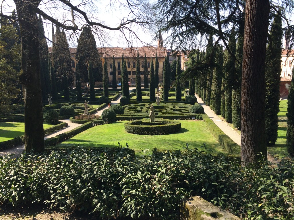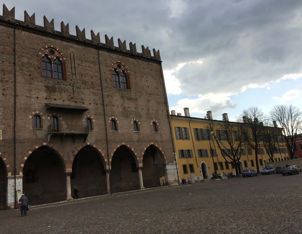 We made a side trip to Mantua (Romeo and Juliet, Love’s Labours Lost), which required a briefish and rather dull train ride away through a flat post-industrial landscape of nondescript small towns and abandoned, derelict factories and warehouses. We had hoped to examine the Palazzo Ducale, ancestral home of the medieval rulers of the city, the Gonzaga, but once again Fortuna was against us as it was shut for the day, although its splendid courtyard and gardens provided a welcome diversion. Mantua itself is an attractive World Heritage city, with a large cobbled piazza leading up to the palazzo, itself approached via a series of colonnaded streets. The town doesn’t just have Shakespearean connections, however, being the location of Verdi’s masterpiece Rigoletto, and its central character the Duke of Mantua, seducer of young women, all round bad egg (and singer of the famous aria Donna è Mobile).