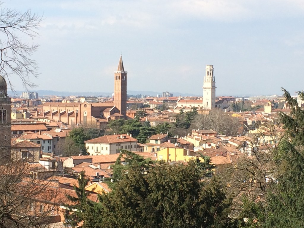 To Verona, by the excellent Frecciarossa high-speed train. Vineyards fringe the route and, away to the right, the snow-capped Dolomites provide a backdrop to the plain. Verona (Romeo and Juliet, Two Gentlemen of Verona) is a pleasant town with a small but interesting historic centre. The noise of traffic that accompanies our walk from the station is somewhat of a shock after the relative silence of Venice. Our B&B, on the edge of the historic centre is rather splendid, with views over the Adige, in some spate, presumably fed by the snow melt from the mountains to the north. After joining the social amble that the Italians call the passeggiata, we discovered what became our regular dining spot, an excellent yet reasonably priced Michelin starred restaurant, Ristorante Maffei, on one side of the busy Piazza delle Erbe. After a reasonable night’s sleep, we found the tombs of the Scaligeri, medieval rulers of the city of Verona. It was the daughter of one the Scaligeri, Regina della Scala, who married Bernabò Visconti of Milan and gave her name to the famous opera house in Milan, La Scala, built on the ruins of the church named in her honour. The most famous of the Scaligeri, Can Grande (Big Dog) whose tomb dominates the family plot, is famous for his patronage of Petrarch and Dante, the latter of whom exiled from Florence lived under Can Grande’s protection. Dante’s statue stands in the middle of the adjacent Piazza dei Signori, looking characteristically grumpy and supercilious.